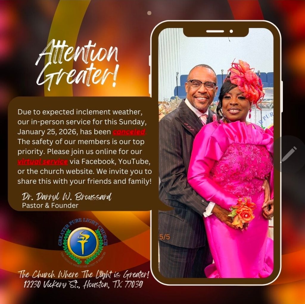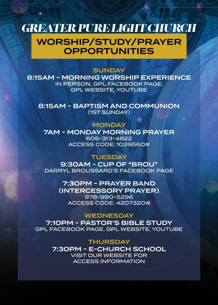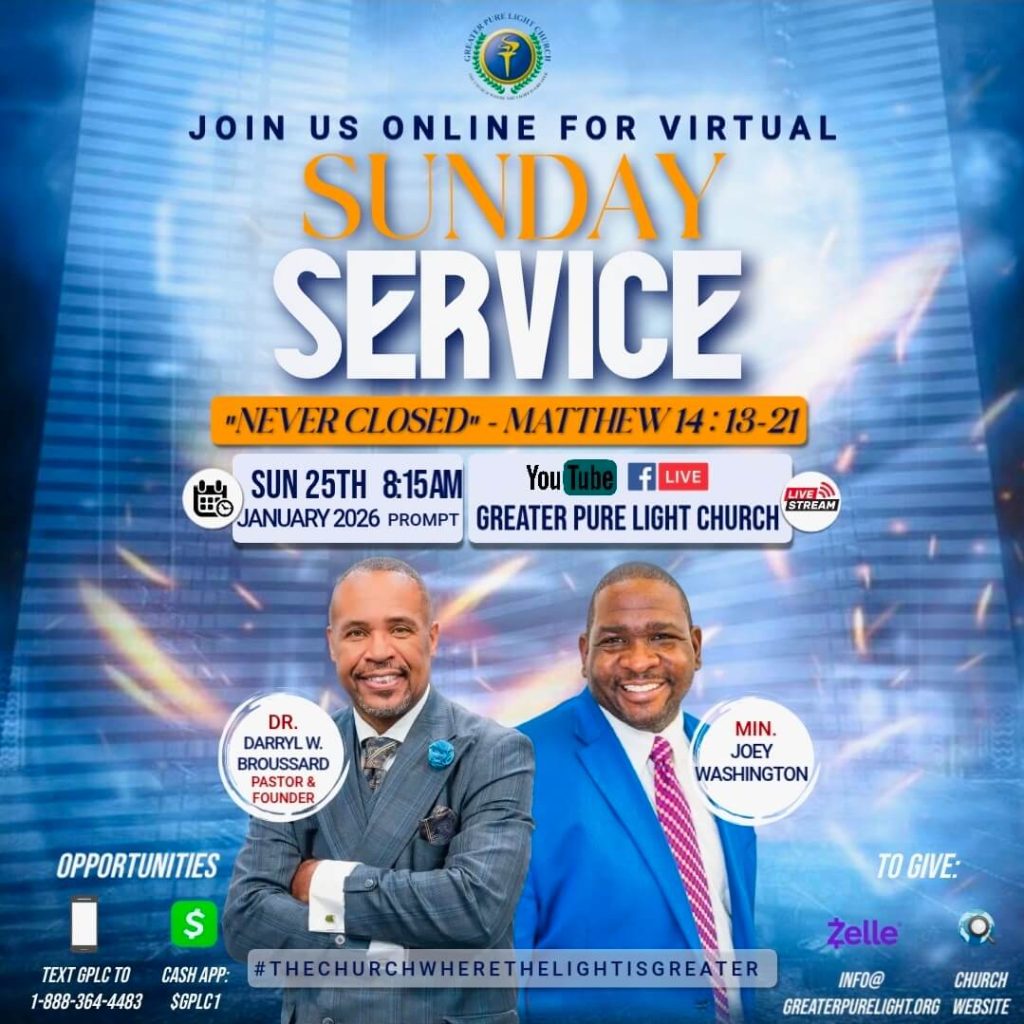 Join Greater Pure Light for one of our Live church services every Sunday @ 8:15AM.