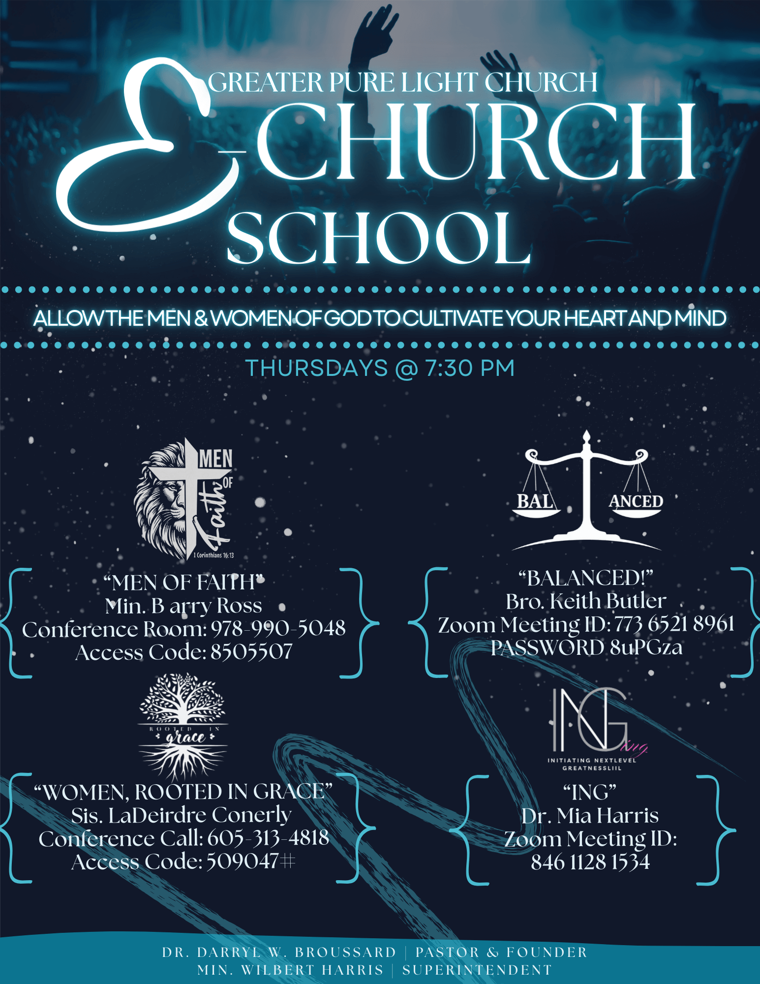 Join Greater Pure Light for one of our Live church services every Sunday @ 8:15AM.